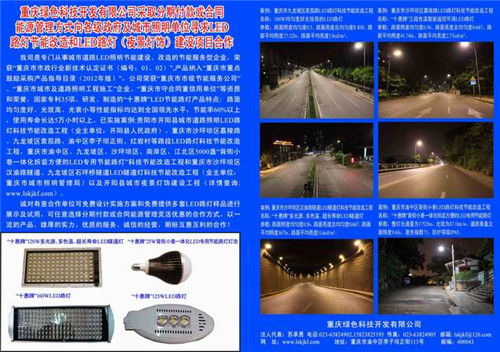 Our company is specialized in energy-saving energy-saving service enterprises, the construction of city road lighting LED transformation, won the "Chongqing municipal energy services company", "Chongqing city and road lighting engineering construction enterprise" and "Chongqing Shou contract re credit units" and other qualifications and honor, products won the "Chongqing municipal industry new technology (certificate number: 01, 02)," into the "Chongqing city focus on encouraging the purchase of product catalog (2012 Edition)", has 35 national patents. Research and manufacture of "ten Hui card" LED energy saving lamp features: the road of good uniformity, high light efficiency, small attenuation performance indicators have reached the leading level, energy saving rate of more than 60%, the service life of up to 50 thousand hours or more. The case has been implemented: Guiyang City Kaiyang County city road lighting LED lighting technology, energy-saving renovation project in Chongqing District of Shapingba City, Jialing Road, Jiulongpo District, Yuzhong District, Qielu Liziba street, Hongyan Village Road LED street lamp energy-saving technology renovation project, Chongqing City, Yuzhong District, Jiulongpo District, Shapingba District, Nanan District, Jiangbei District 5000 "back alleys of energy-saving renovation project integration easy LED special technology and energy-saving lamps" in Shapingba District of Chongqing City Han Yu Road Tunnel, Jiulongpo Shiping bridge tunnel LED tunnel lamp energy-saving technology