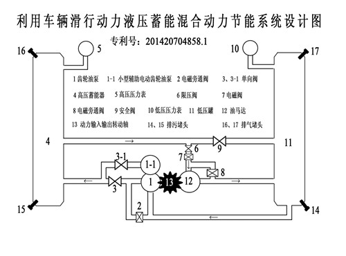 一、一種利用車輛滑行動力液壓蓄能混合動力節能系統工作原理 (專利號:201420704858.1)
