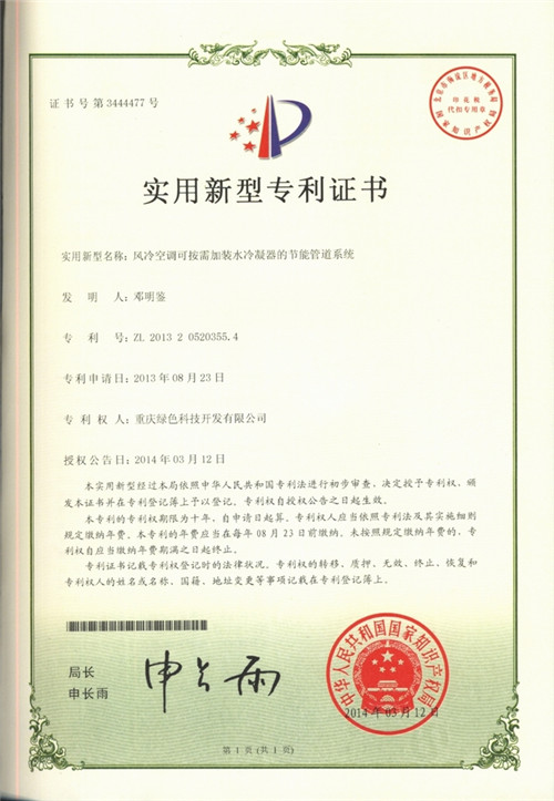 此專利技術由于在傳統風冷空調中任意加裝水冷冷凝器節能管道系統,因而適應性強,拆裝方便,可提高制冷制熱功率30%,同時降低工作電流30%左右。工作原理:通過風冷冷凝及水冷冷凝形成雙級冷凝的冷凝結構,能有效解決傳統風冷空調單一采用風冷冷凝方式導致冷凝壓力高、制冷劑溫度高、壓縮機負荷較重、溫度高、磨損大、噪聲大、能耗高、制冷效率低的問題。