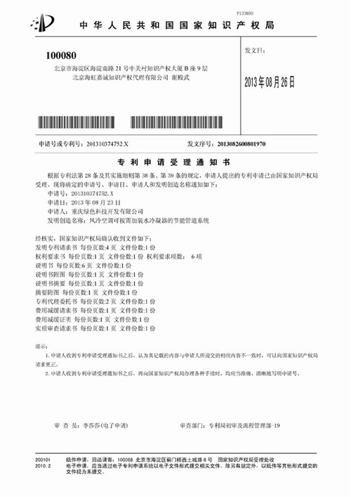 3. 風冷空調可按需加裝水冷凝器的節能管道系統《專利申請受理通知書》(實用新型專利)復印件