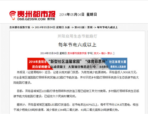 熱烈祝賀我司實施改造的貴州省開陽縣縣城LED路燈工程被貴州省主流媒體《貴州都市報》肯定。2014年5月4日《貴州都市報》對我司實施改造的貴州省開陽縣縣城LED路燈工程進行了報道,現將全文轉載如下: