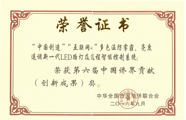 我司研發(fā)制造的“中國創(chuàng)造”“互聯(lián)網(wǎng)+”多色溫防霧霾、亮度遙調(diào)新一代LED路燈及遠(yuǎn)程智能控制系統(tǒng)于2016年9月榮獲第六屆中國僑界貢獻(xiàn)(創(chuàng)新成果)獎。