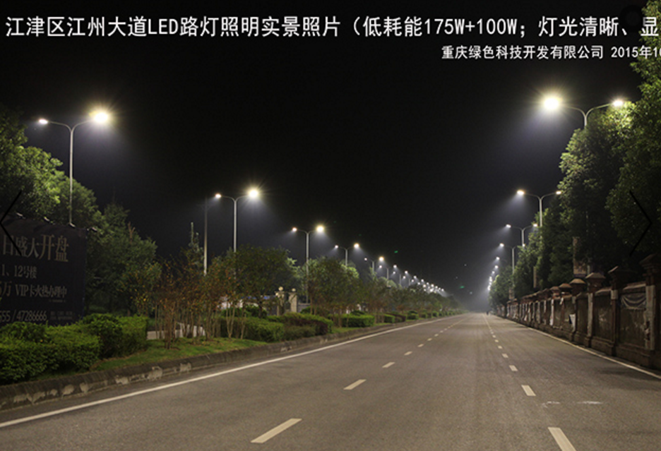 重慶城建經濟(集團)重慶綠色科技開發(集團)有限公司對江津區江州大道實施的175W+100W“十惠牌”LED智能路燈替換440W+275W鈉燈節能改造項目,主要具有路面燈光清晰度高(顯指70)、均勻度好、光效高等特點,該燈具性能指標均領先全國同類產品,若配用我司自主研發的專利技術“互聯網+多色溫LED路燈、隧道燈六遙(多色溫、遙調、遙測、遙控、遙視、遙信)控制系統”(專利號:2015204938054)可實現智能控制。本產品是我司利用多項自主專利技術(專利號:201320842388、201320028126、2015204938054)研發、制造的LED智能路燈產品,并已獲得“重慶市高新技術產品”、“重慶市市政行業新技術認證”。案例實景照片展示如下(2015年10月16日):