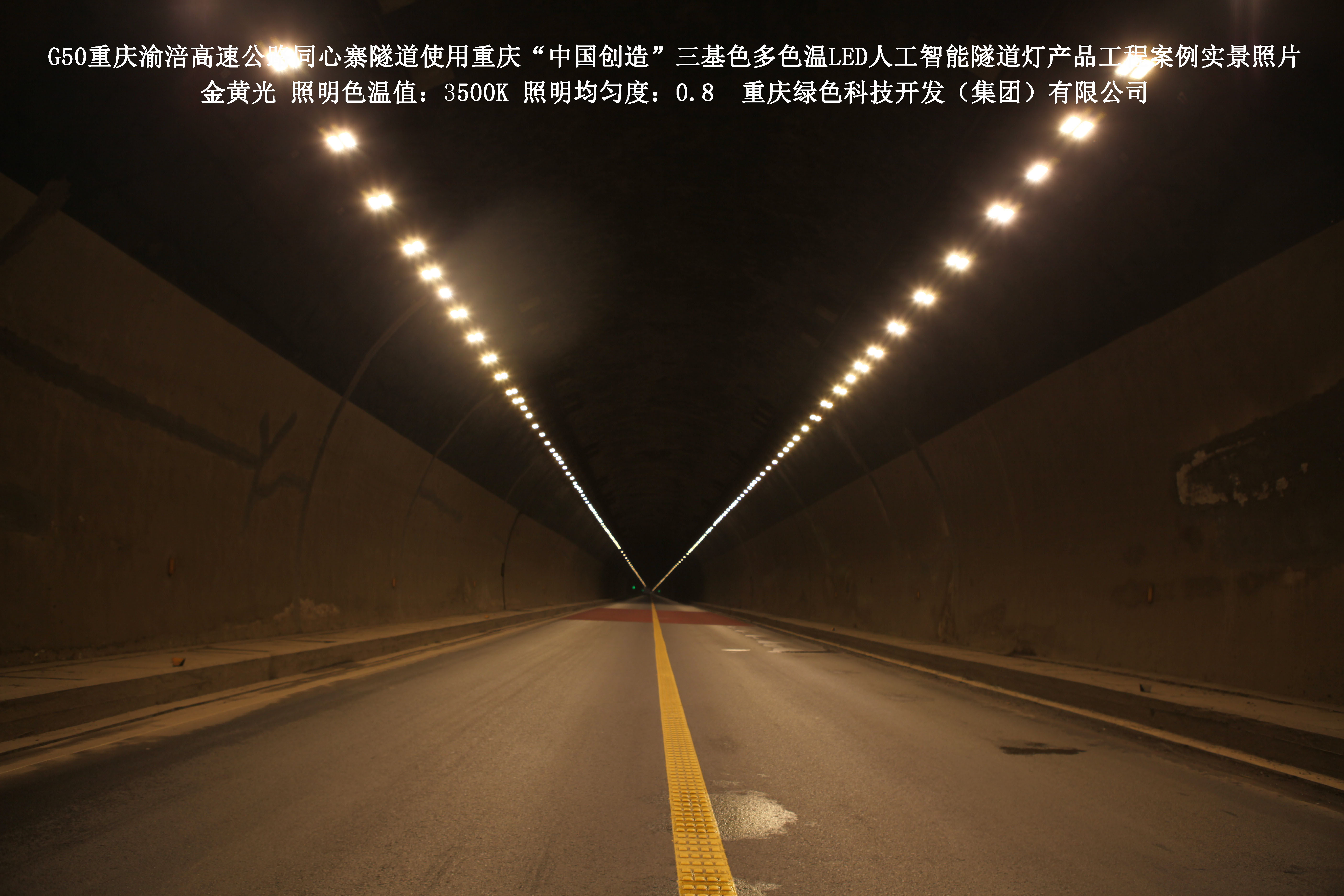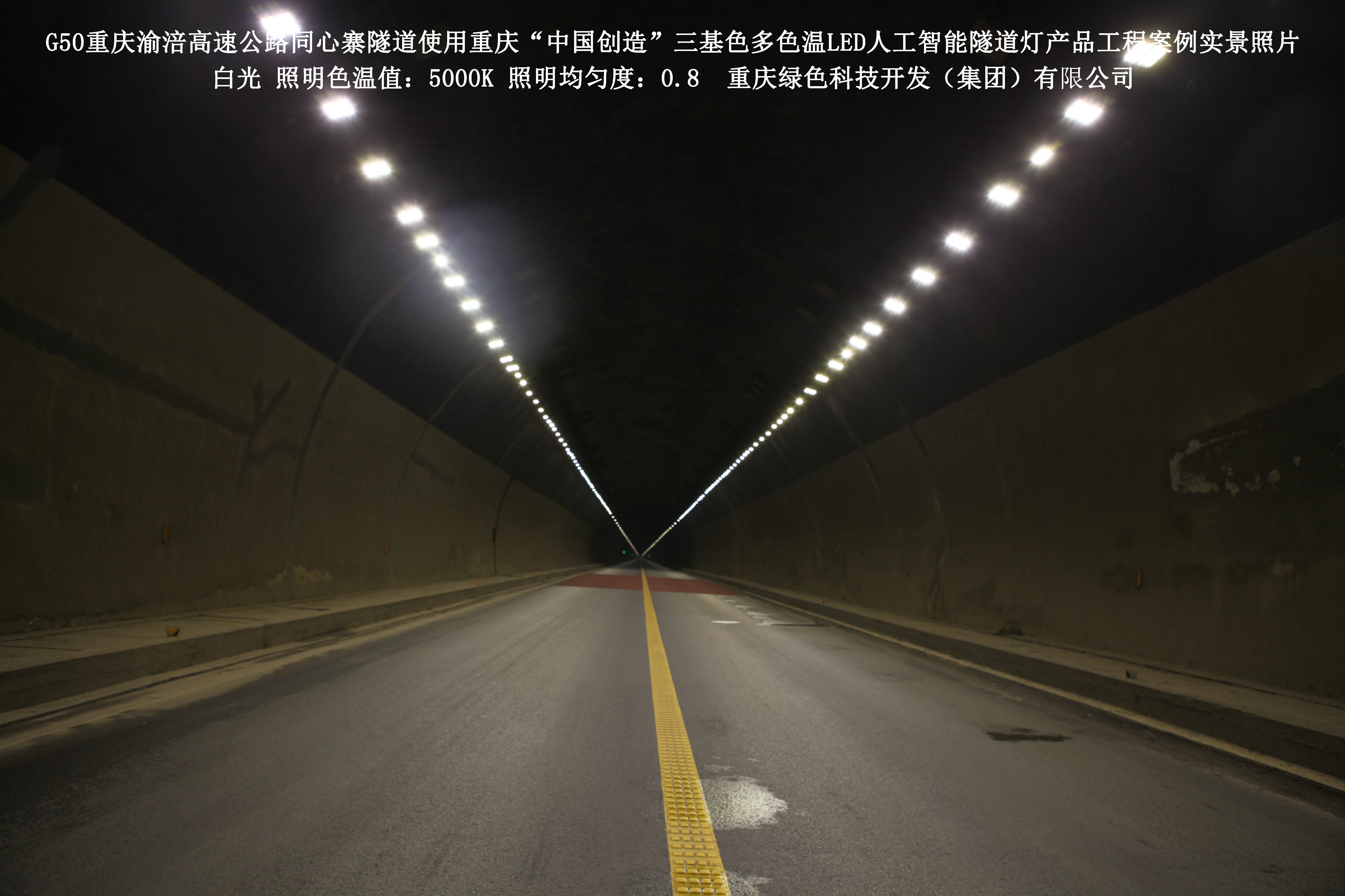 2016年7月,重慶渝涪高速公路有限公司使用了我司研發制造的重慶“中國創造”三基色多色溫LED人工智能隧道燈,對G50重慶渝涪高速公路同心寨隧道實施了綠色照明科技節能改造工程,工程實施后,極大地提高了隧道內照明清晰度、燈光均勻度、舒適度。通過智能終端實現單燈感知、線纜防盜報警,與原高壓鈉燈相比,節能率60%以上,有效解決了關閉控制回路或間隔關燈方式造成的照明暗區,確保車輛通行的安全。