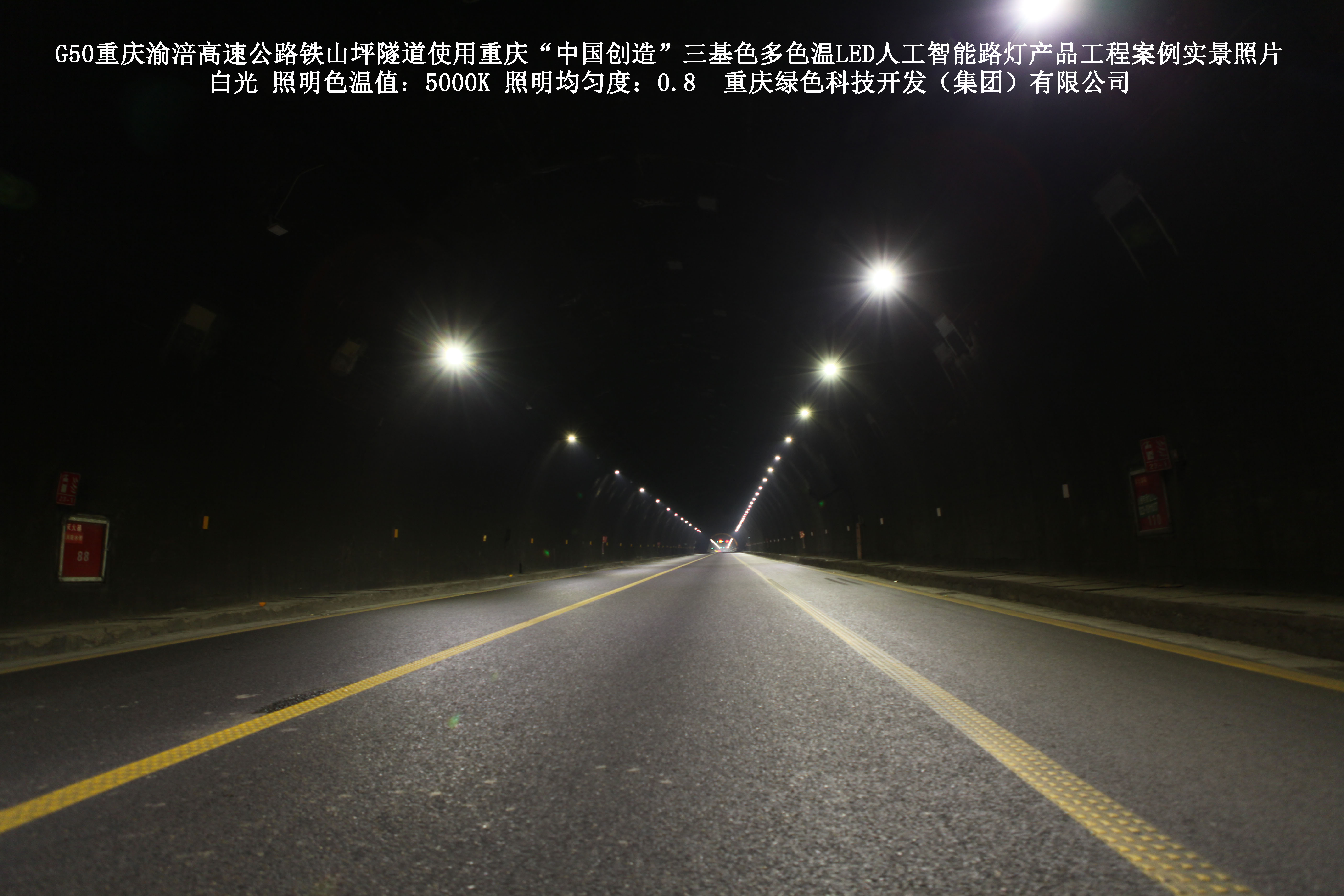 2015年9月,重慶渝涪高速公路有限公司使用了我司研發制造的重慶“中國創造”三基色多色溫LED人工智能隧道燈,對G50重慶渝涪高速公路鐵山坪隧道實施了綠色照明科技節能改造工程,工程實施后,極大地提高了隧道內照明清晰度、燈光均勻度、舒適度。通過智能終端實現單燈感知、線纜防盜報警,與原高壓鈉燈相比,節能率60%以上,有效解決了關閉控制回路或間隔關燈方式造成的照明暗區,確保車輛通行的安全。